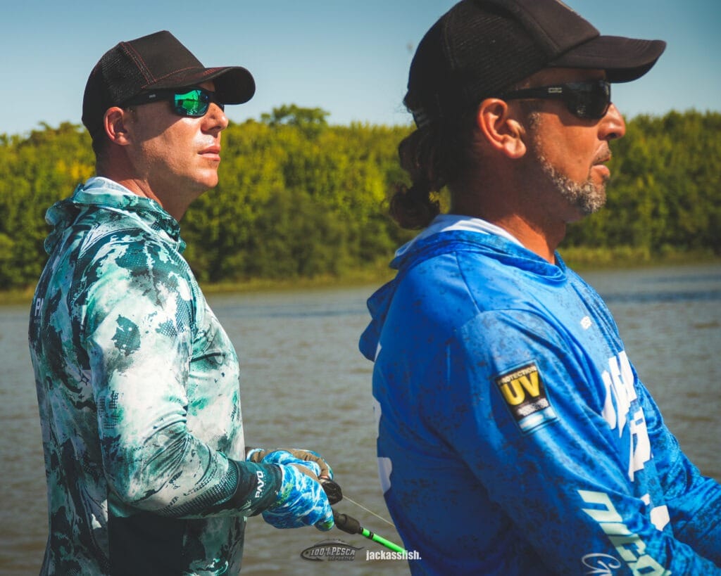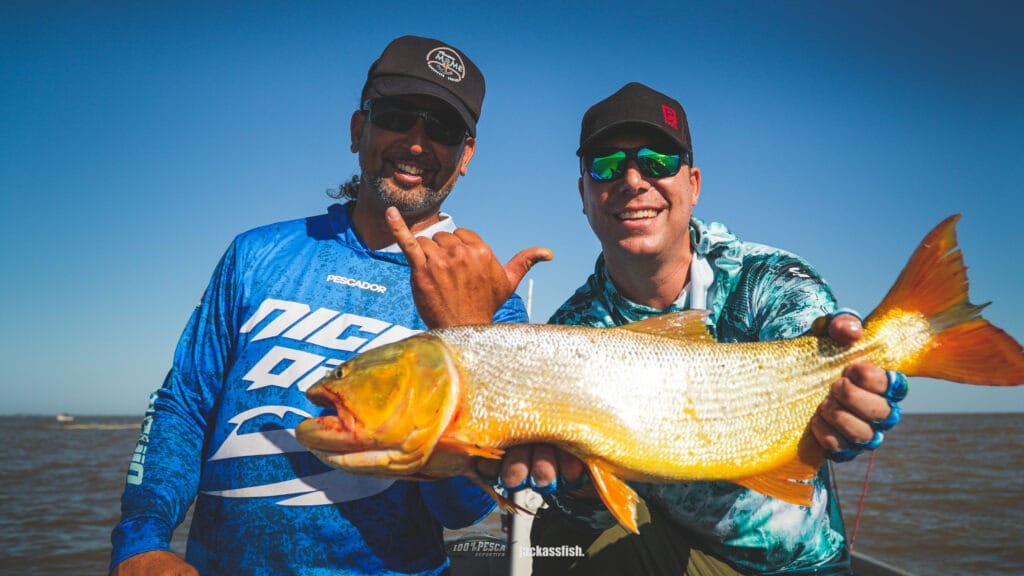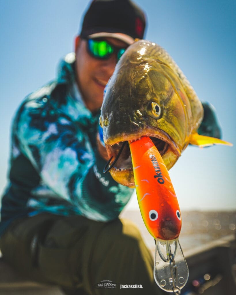 Armamos las cañas y comenzamos a barrera la cancha desde el espigón hacia el rio, con tiros que pasaran unos 20 metros los palos (o mas es mejor aún), logrando así que los señuelos agarren esa chupada de agua que los haga golpear en las piedras…. En ese momento, es cuando seguramente tengamos los piques, a la altura de los palos. El desafío aca, es por un lado clavarlos, y luego lograr que no nos ganen los palos para evitar perderlos. Luego de eso, suele estar el problema resuelto, aunque no es conveniente relajarse, ya que puede soltarse fácilmente incluso al lado de la embarcación. Utilizamos cañas de baitcast (aca los largos dependen de la comodidad aunque recomiendo cargas de 7”), multifilamento de unas 40 libras mínimo por los roces y señuelos de tipo banana o minnow, que fueron los que rindieron ese día. Las capturas no tardaron en llegar, obteniendo un par de ejemplares mas que dignos para esta zona de pesca.