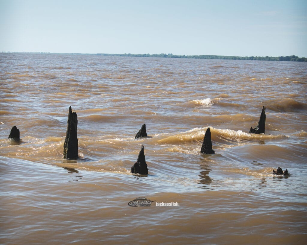 Asi fue que sin dudarlo encaramos donde empieza esta mítica fila de palos, que básicamente fueron los delimitadores para que los barcos ingresen el antiguo puerto del plata, y en su base tienen una base rocosa muy grande que cumple el rol de barrera de contención para frenar los sedimentos. En ese lugar, con esas estructuras, el juego entre mareas genera un ambiente excepcional para que algunas especies forrajeras se acerquen a comer las conchillas que se asientan en grandes bancos sobre estos palos junto a carpas, armados, manduvas y sábalos entre otros, que son banquete servido en bandeja para los cazadores dorados de la zona.