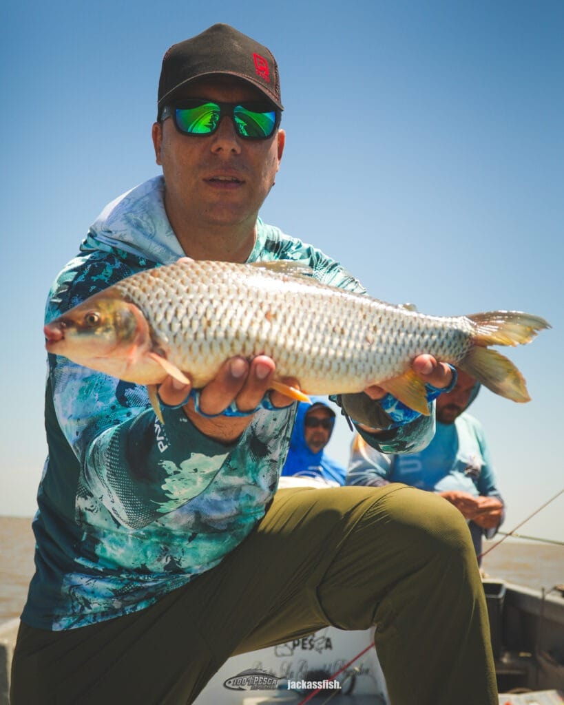 Una vez que estábamos todos los actores, era la hora de subir a “la valentina” y encarar la salida al Rio, custodiados por el drone de 100%pesca. Una vista magnífica, lugares espectaculares y la mezcla perfecta entre rayos del sol, el verde del entorno y la masa de agua que se escurre entre los espacios que encuentra, junto a los muelles decorados por los barcos y veleros. No solo eso metia el folclore, sino que aparecían las medialunas y los mates, para encarar los malecones con la última parte de la bajante.